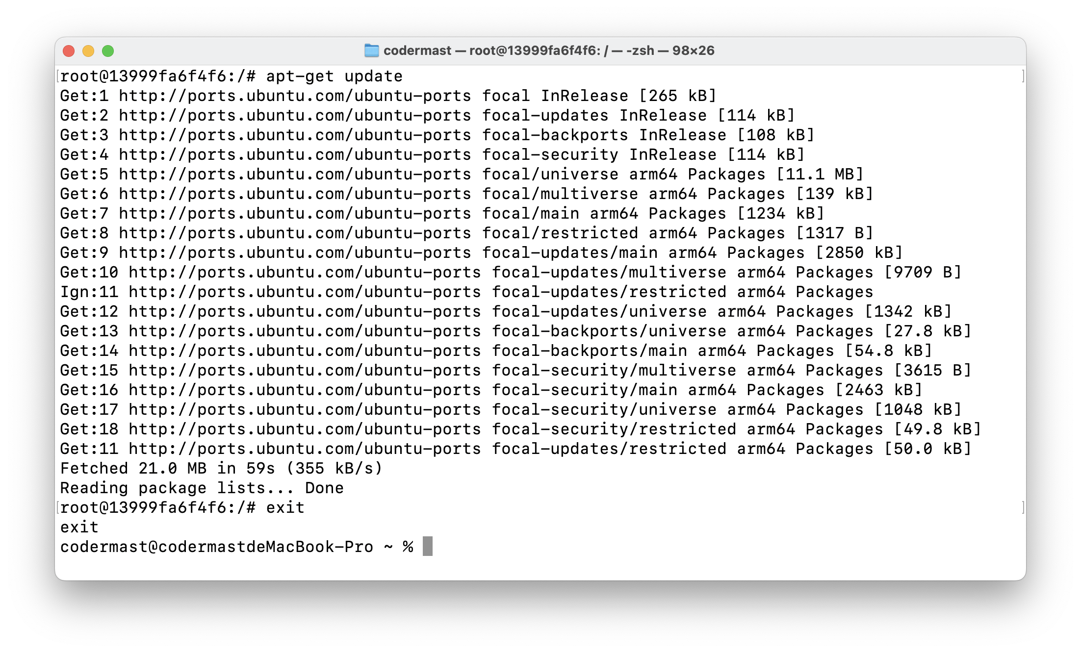 apt-get update指令,更新 ubuntu 系统,更新后exit退出这个容器到我们本地的命令控制端。