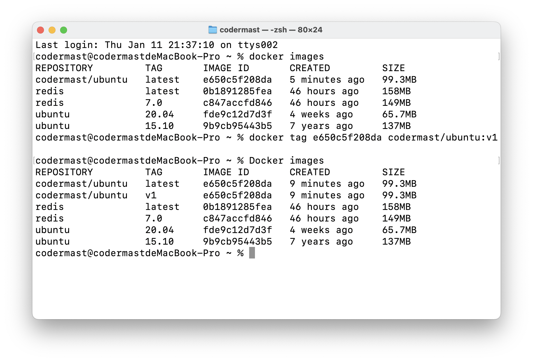 此时我们在创建 Docker 容器时,既可以使用 codermast/ubuntu:latest 也可以使用 codermast/ubuntu:v1。