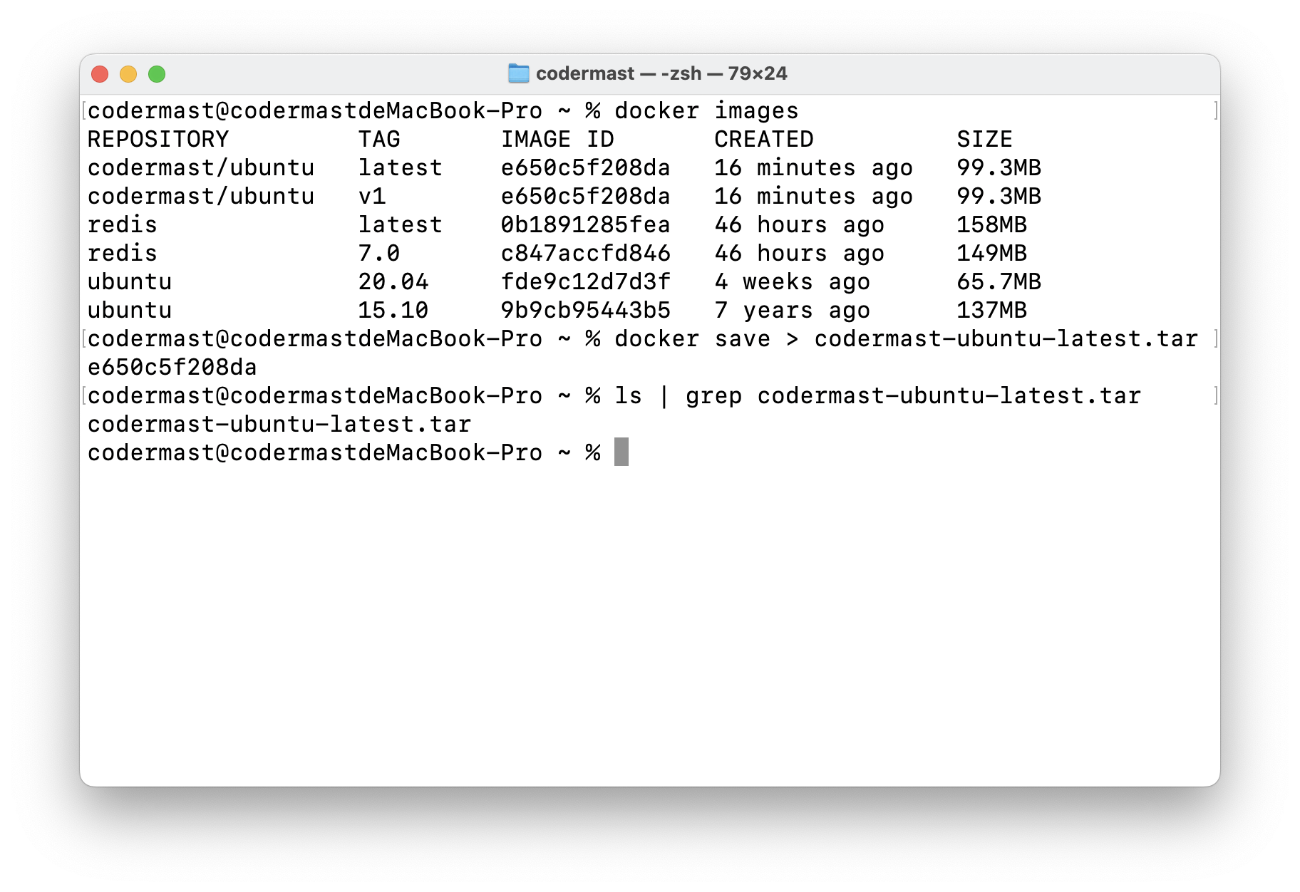 docker save > codermast-ubuntu-latest.tar e650c5f208da- codermast-ubuntu-latest.tar:要导出的文件名