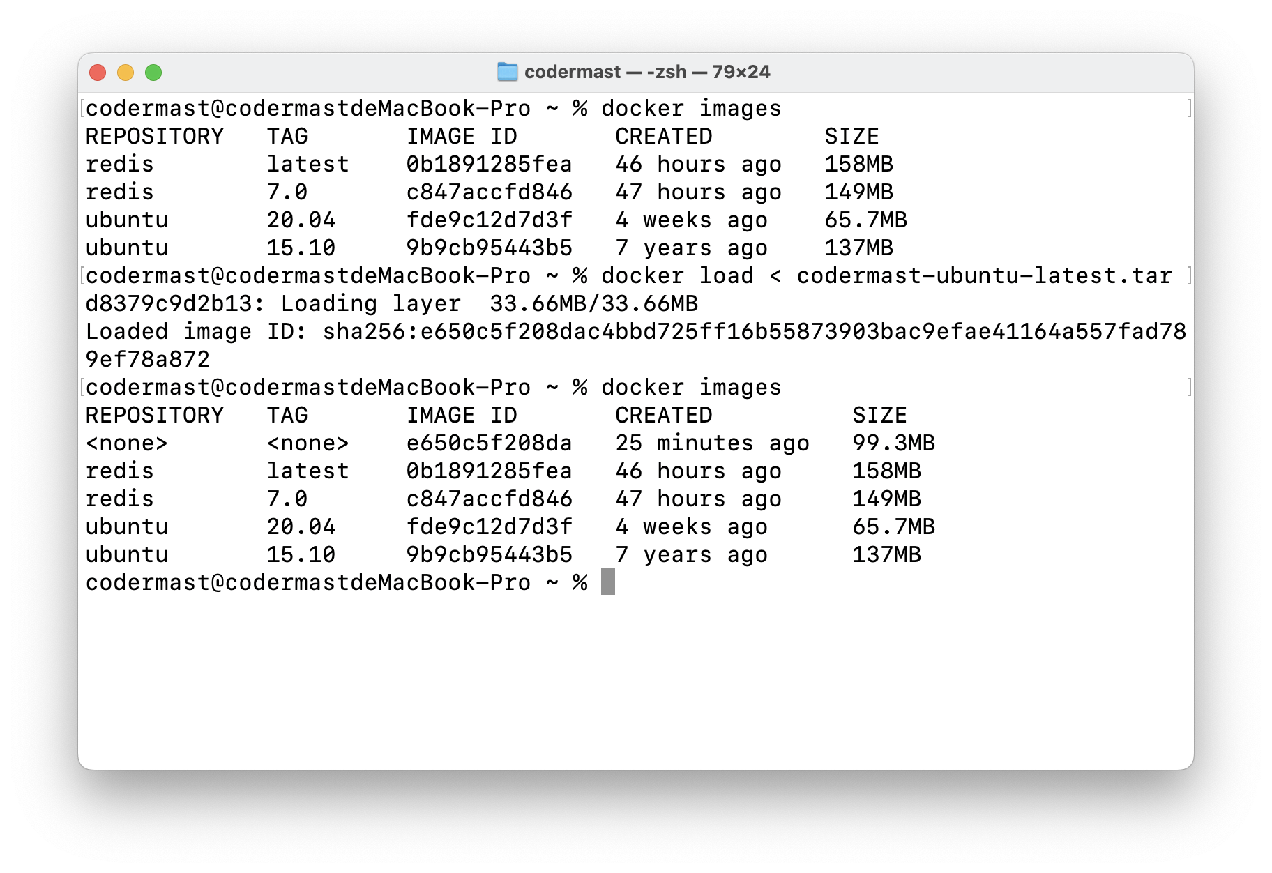 docker load < codermast-ubuntu-latest.tar- codermast-ubuntu-latest.tar:为要导入的文件名。