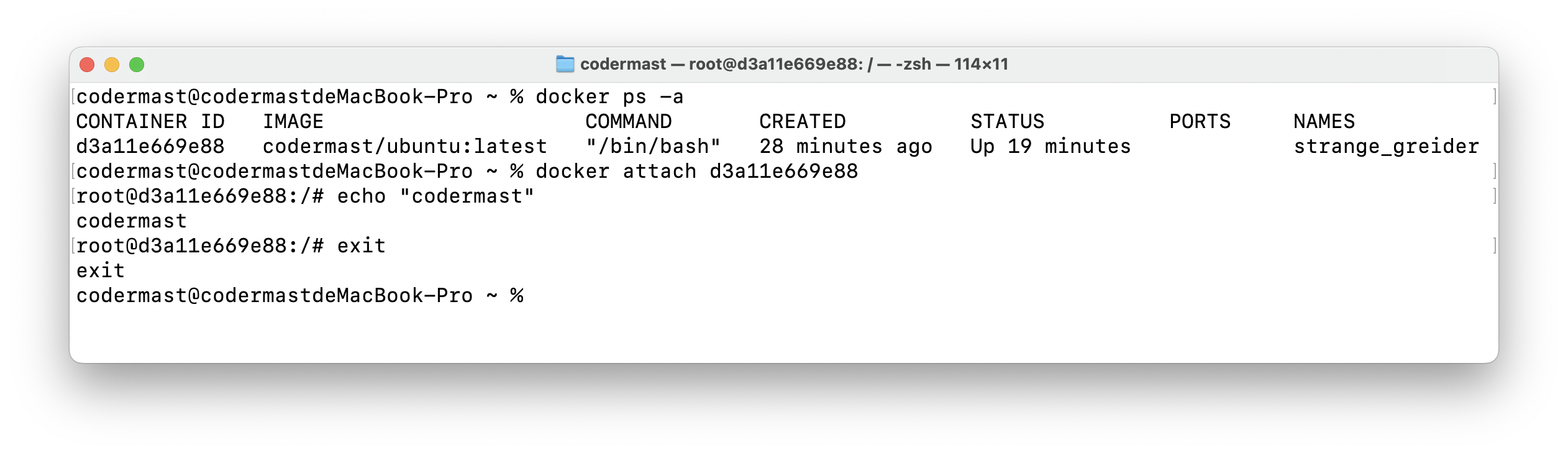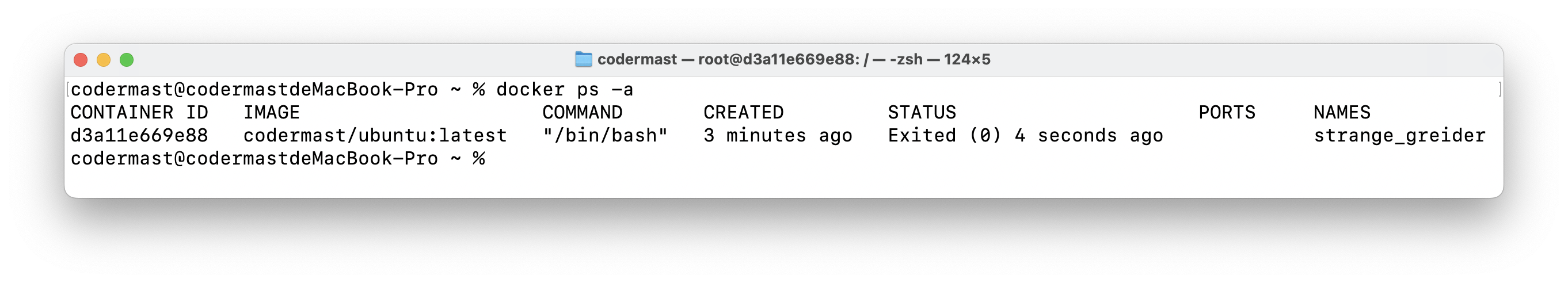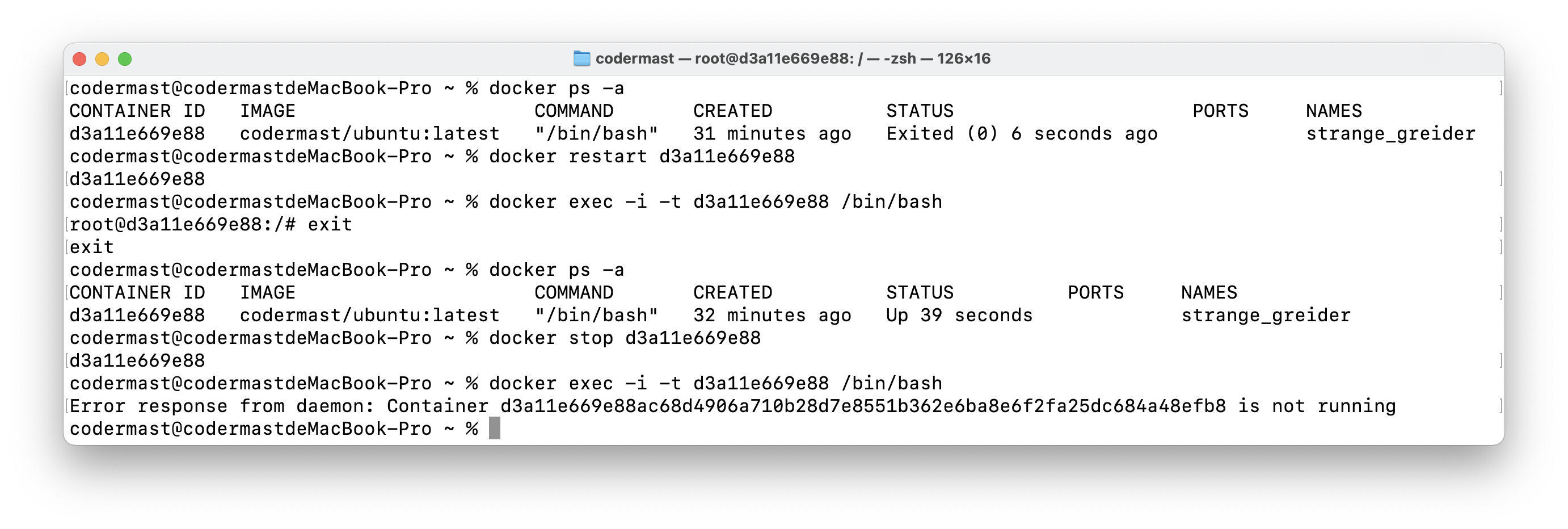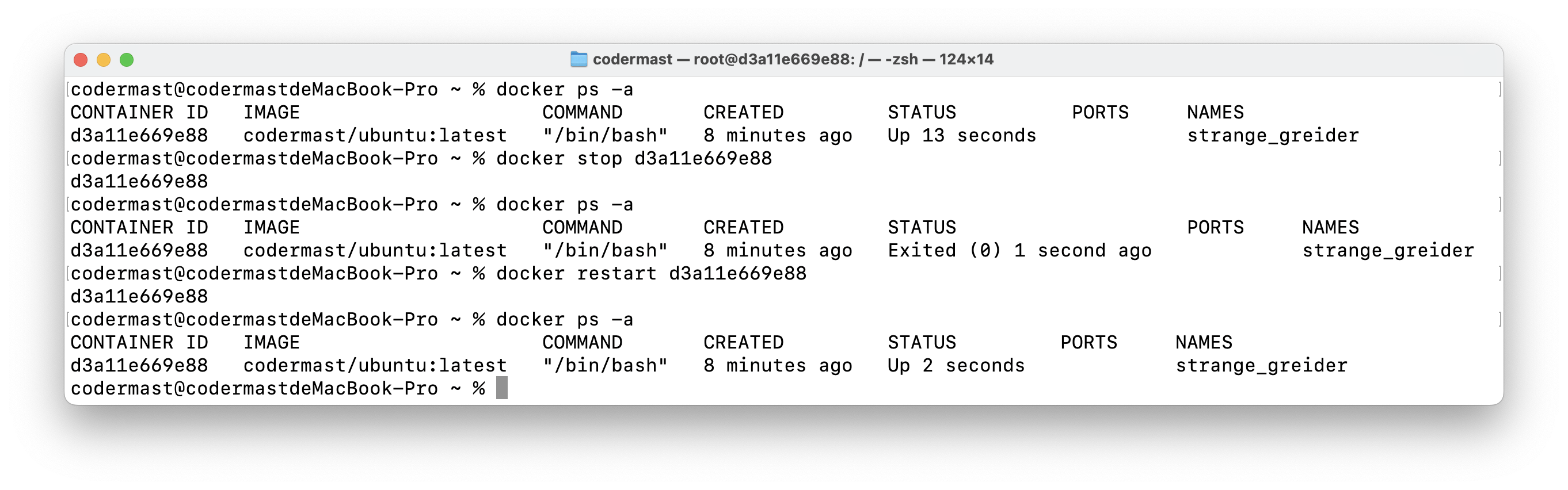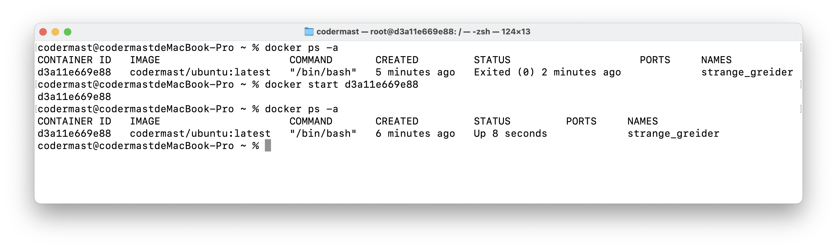 我们看到,刚才 codermast/ubuntu:latest 的实例d3a11e669e88 已经停止了Exited (0) 4 seconds ago,我们重启这个实例