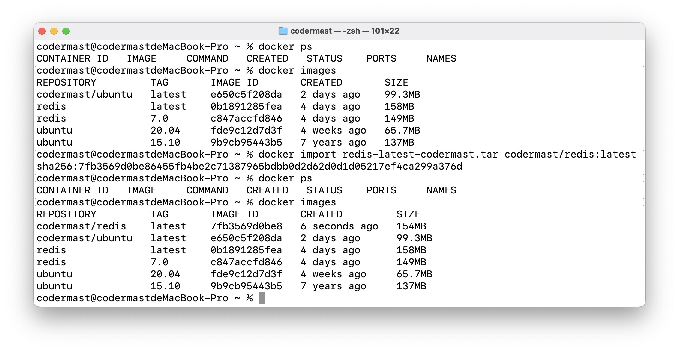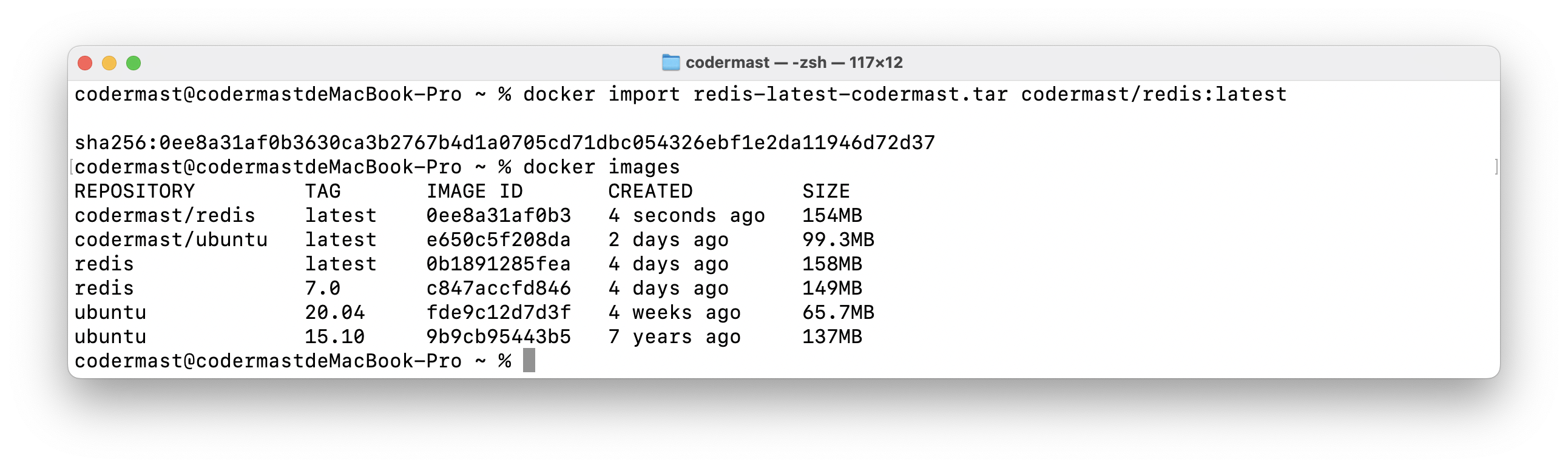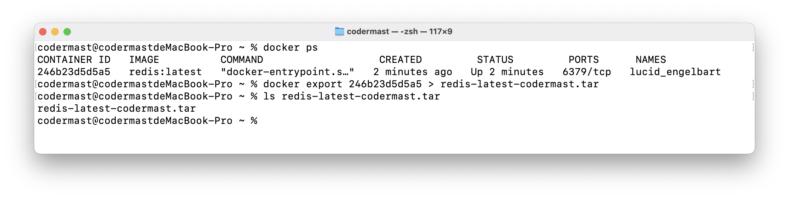 docker export 246b23d5d5a5 > redis-latest-codermast.tar- 246b23d5d5a5:容器 ID