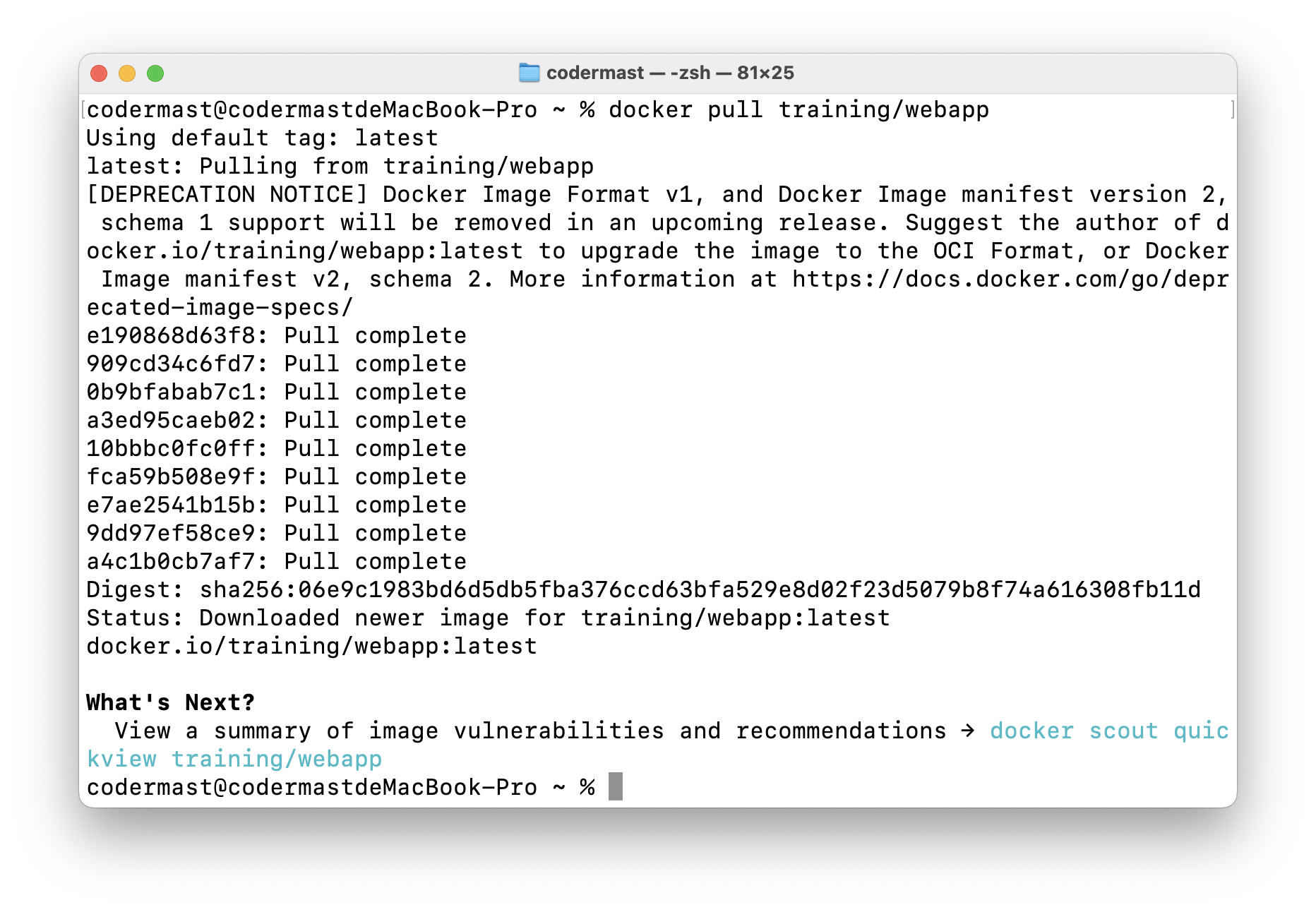 这里出现了警告信息,是因为我的电脑是 M1 芯片,是 ARM 架构,而所需要的平台是请求的映像的平台(linux/aamd64)与检测到的主机平台(linux/alm64/v8)不匹配,这里每个人的电脑环境不同,不必理会。