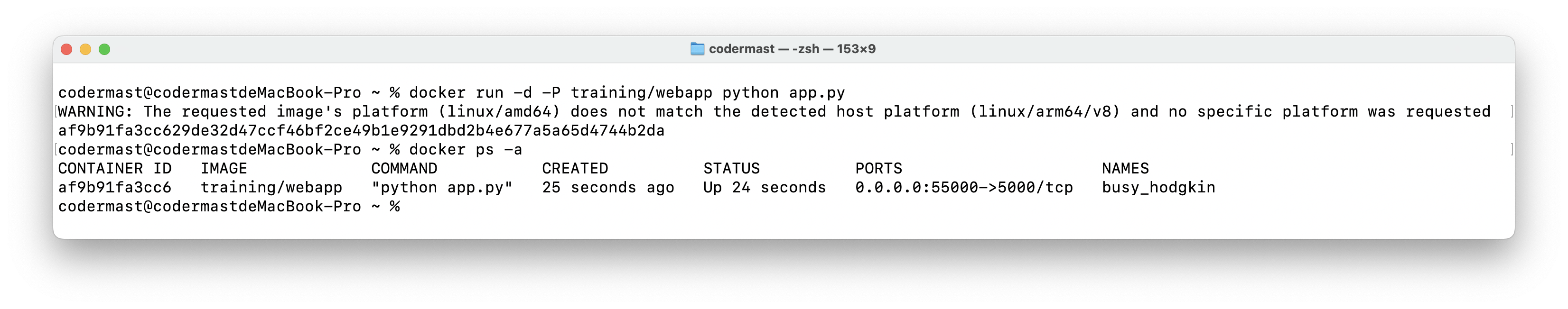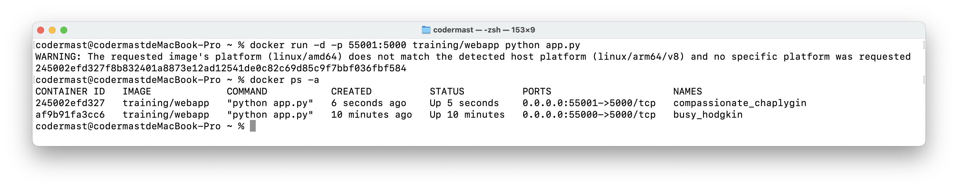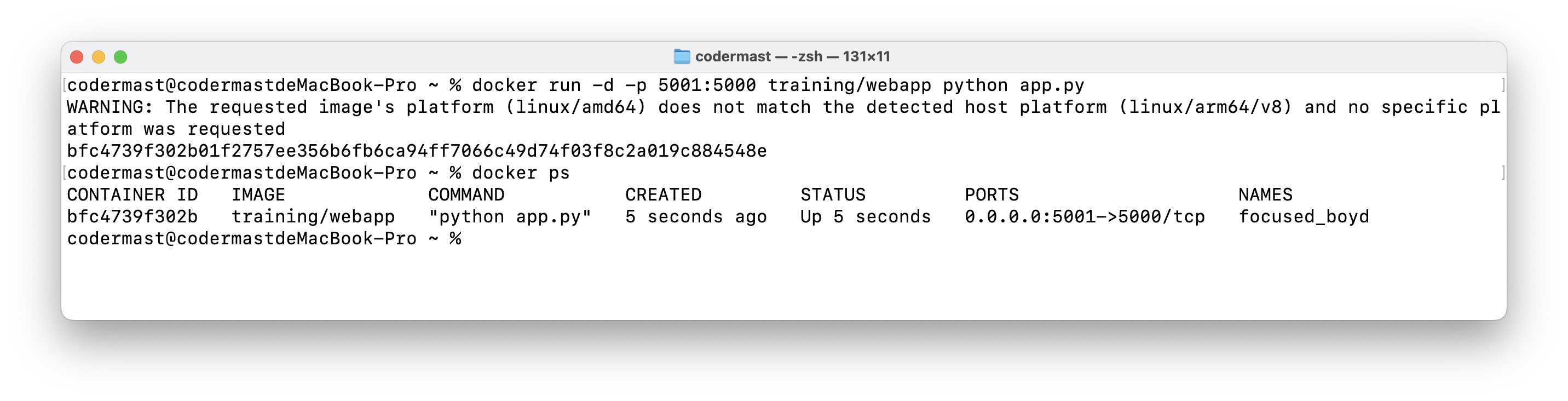 docker run -d -p 5001:5000 training/webapp python app.py即将本机的 5001 端口绑定到容器内部的 5000 端口上。
